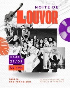 O grupo de jovens PROJES (Projeto Juventude Em Busca de Santidade), de Viana, realiza neste sábado, 27 de setembro, um momento especial de fé e alegria, a Noite de Louvor. O evento será às 19h, na Comunidade São Francisco de Assis, em Marcílio de Noronha II.